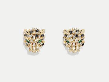18K gold panther-head studs set with emerald and white diamonds — fierce, refined, and powerful