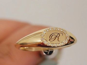 18K gold signet ring framed with diamonds, personalized with a delicate engraved “R.”